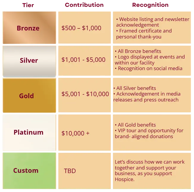 We’ve designed contribution tiers to suit different business sizes, values, budgets, and desired levels of visibility. Every Business Champion receives formal recognition and our heartfelt thanks.